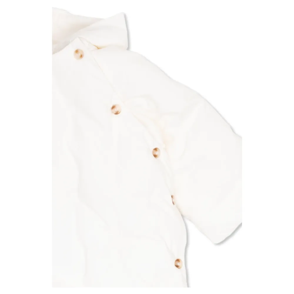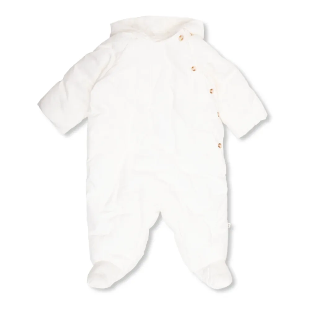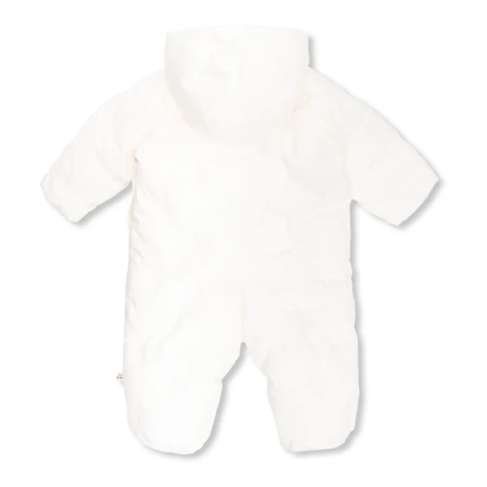 Weißer Caramelo isolierter Overall mit Kapuze von Bonpoint. Aus Baumwolle gefertigt, wird dieses Modell mit Knöpfen geschlossen und zeigt ein besticktes Muster mit charakteristischen Kirschen und langen Ärmeln.