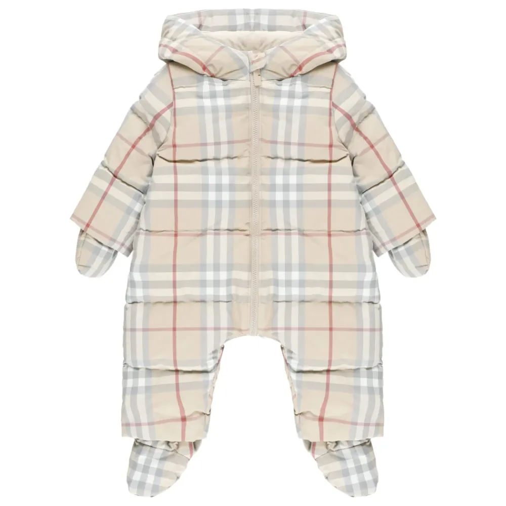 Kleide deinen kleinen Jungen stilvoll mit diesem beigen Burberry Infant gesteppten Overall mit Kapuze, langen Ärmeln, Frontreißverschluss und einem Allover-Karomuster.