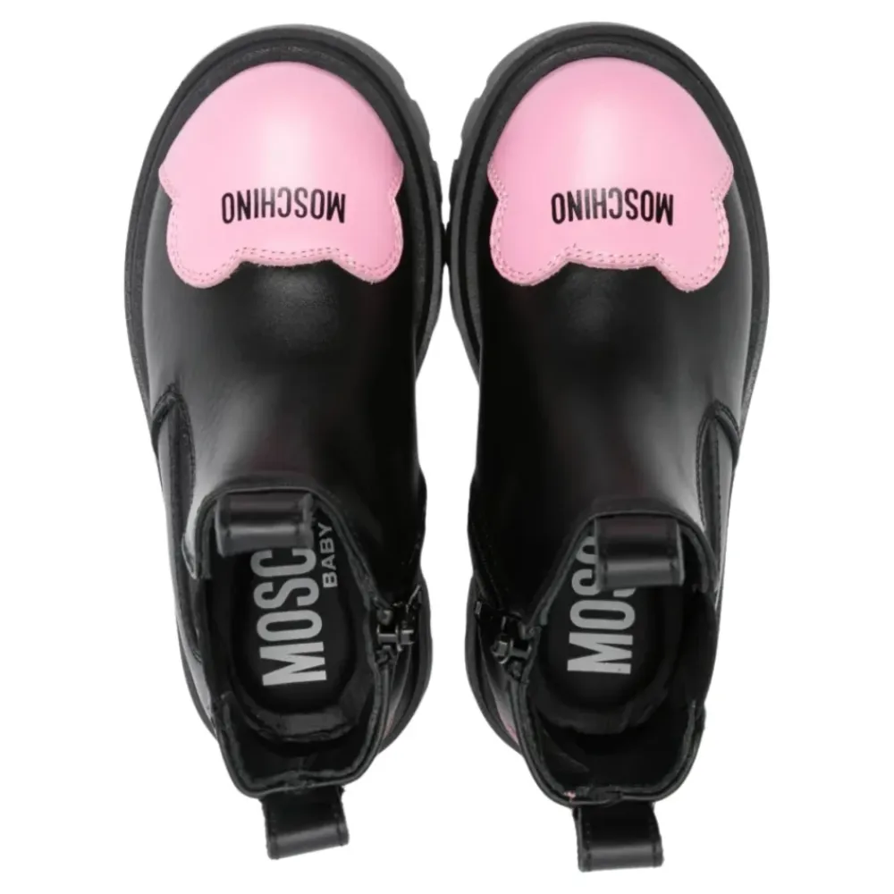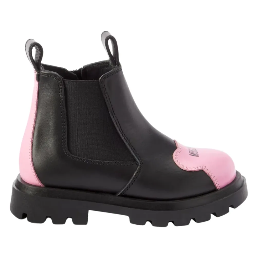 Entdecken Sie die stilvollen Moschino Leder-Stiefeletten mit einem schicken schwarzen Design und kontrastierenden pinkfarbenen Einsätzen. Perfekt, um jedem Outfit einen Hauch von Eleganz zu verleihen. Wichtige Merkmale: Schwarz | Pink | Leder | Seitlicher Reißverschluss | Elastisches Seitenband | Runde Spitze | Logo auf der Spitze | Zusammensetzung und Pflege: 100% Leder