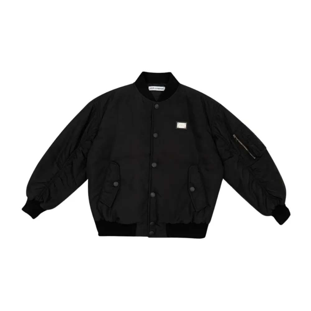Schwarze isolierte Bomberjacke von Dolce Gabbana Kids. Mit Druckknöpfen befestigt, hat diese eine tae-lv-farbene Logo-Applikation, zwei snap-fixierte Klappen und gerippte Bündchen am Kragen, dem Fall und den Manschetten.