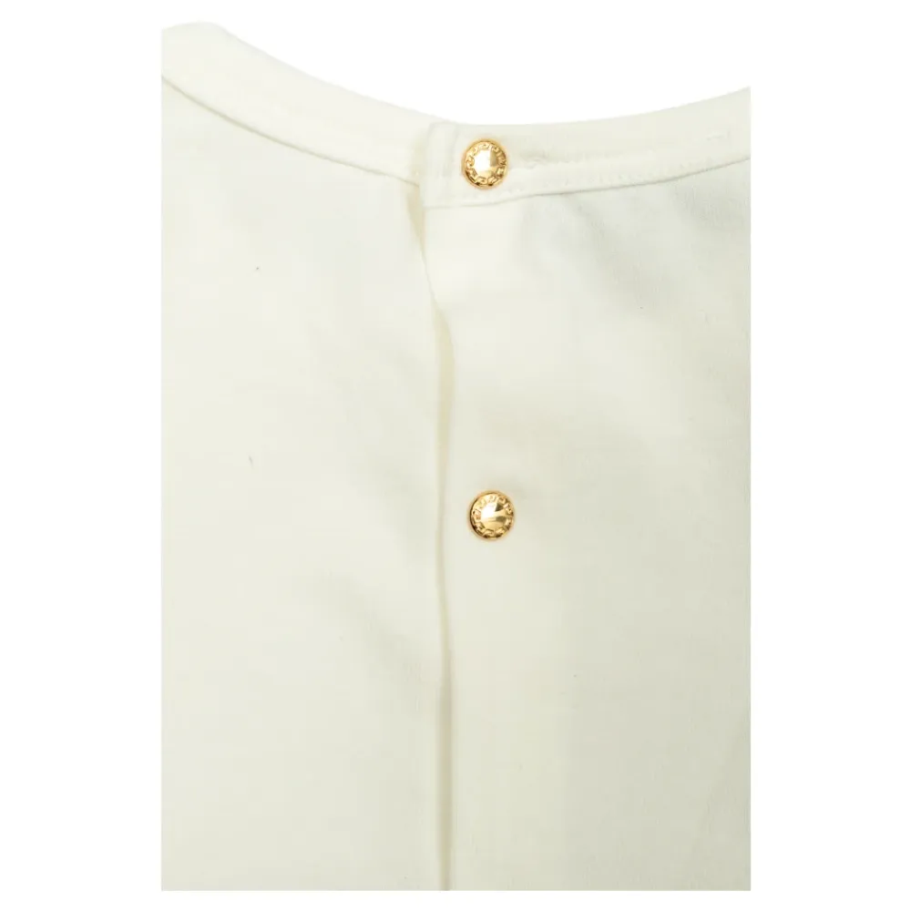 Versace präsentiert den Logo Bodysuit, einen weichen Einteiler in einem Creme- und Beigeton mit charakteristischen Logo-Details. Er ist für einfaches Anziehen konzipiert und kombiniert ein glattes Oberteil mit einem dezent gemusterten Unterteil für einen raffinierten, tragbaren Look. Hauptmerkmale: Beige | Creme | Baumwollmischung | Druckknöpfe am Rücken für einfaches Wechseln | Einteiliges Design | Cremefarbenes Oberteil mit dezentem floralem/barockem Muster im Unterteil | Dekorativer Logo-Print auf der Brust | Dekorative Knöpfe mit Logo | Zusammensetzung & Pflege: Baumwolle | Elasthan