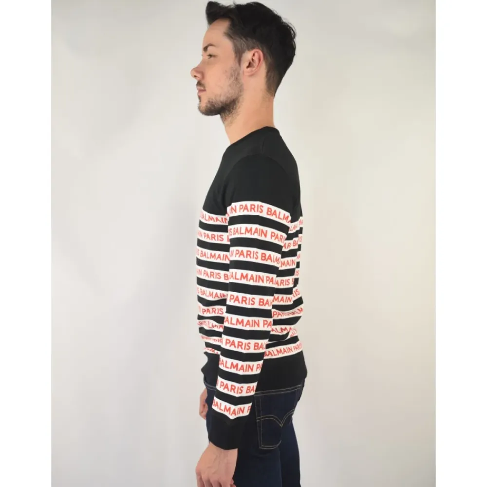 Balmain präsentiert das Logo Let Rundhals-Sweatshirt, ein stilvolles Kleidungsstück mit Allover-Logo-Schriftzug und kontrastierenden horizontalen Bändern. Perfekt für Frühling und Herbst, kombiniert dieses Sweatshirt Komfort und Mode mühelos. Wichtige Merkmale: Schwarz | 100% Baumwolle | Rundhalsausschnitt | Allover-Logo-Schriftzug | Kontrastierende horizontale Bänder | Maße und Passform: Normale Passform | Zusammensetzung und Pflege: 100% Baumwolle | Maschinenwäsche kalt, trocknergeeignet bei niedriger Temperatur.