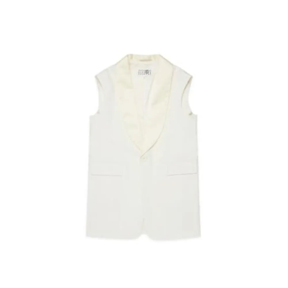 Das MM6 Maison Margiela Logo Schalkragen Gilet kombiniert eine klare, taillierte Silhouette mit auffälligen Markendetails. Sein ärmelloses Design und die geknöpfte, einreihige Vorderseite machen es ideal für Layering-Looks und Smart-Casual-Outfits. Hauptmerkmale: Beige | Creme | Einreihiger Knopfverschluss | Zwei Vordertaschen | Ärmellos | Schalkragen | Weißes Logo-Detail | Gerader Saum
