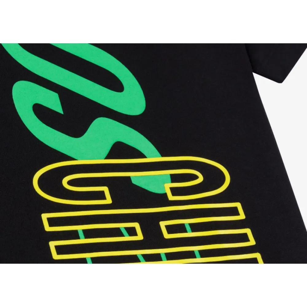 Moschino Logo T-Shirt – ein Baumwoll-T-Shirt mit Rundhalsausschnitt, das durch einen holografischen Logo-Print besticht und sich ideal für das Alltagsstyling eignet. Hauptmerkmale: Schwarz | Baumwolle | Rundhalsausschnitt | Kurze Ärmel | Gerader Saum | Holografischer Logo-Print