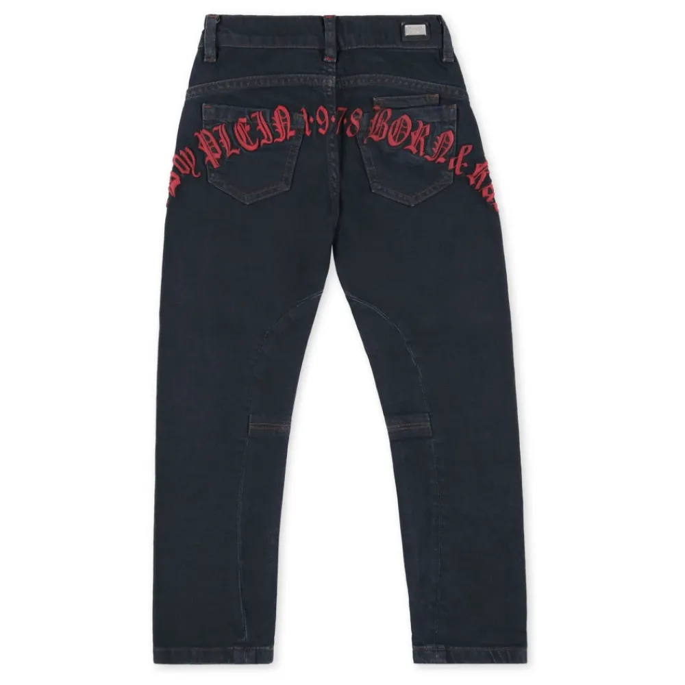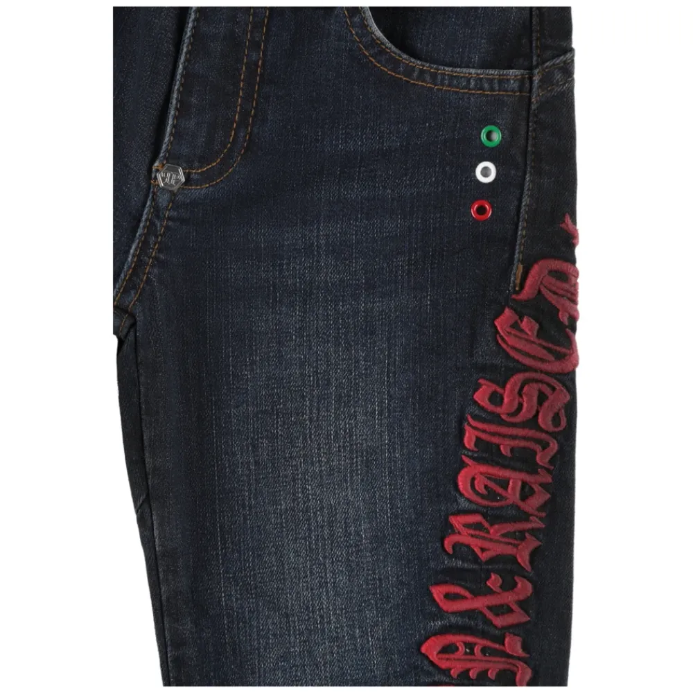 Philipp Plein Milano Cut Gothic Plein Jeans interpretieren den klassischen Stone-washed Denim mit fünf Taschen neu, mit Used-Look-Details, Stickereien und dekorativen Aufnähern für einen auffälligen, modernen Look. Hauptmerkmale: Blau | Fünf-Taschen-Design | Stone-washed-Finish | Used-Look-/Abnutzungsdetails | Gestickte Akzente | Dekorative Aufnäher | Abmessungen & Passform: Milano Cut