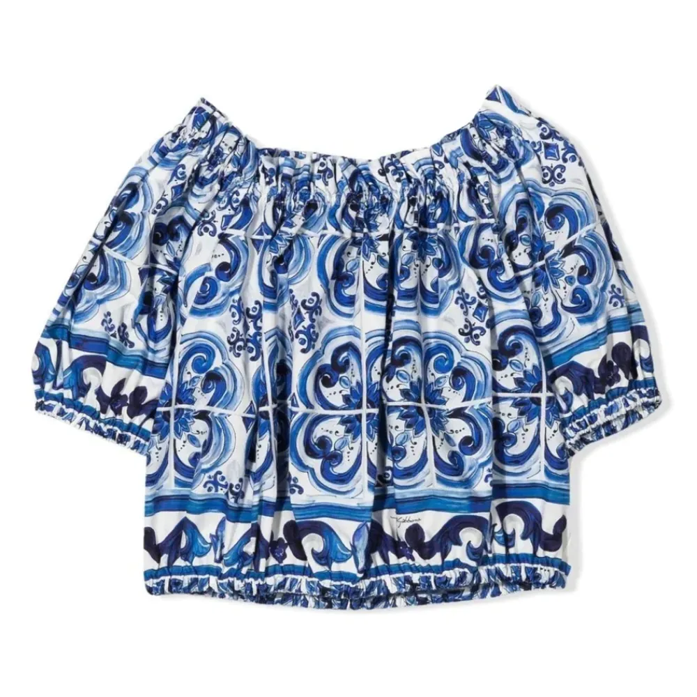 Das Dolce & Gabbana Oberteil mit Majolika-Print aus Popeline kombiniert einen lebhaften Majolika-Fliesendruck mit einer leichten Baumwollpopeline-Konstruktion, ideal für warmes Wetter und Lagenlooks. Hauptmerkmale: Blau | Klares Blau | Baumwolle | Leichte Popeline | Elastischer Saum | Elastische Bündchen | Gereihte elastische Halslinie | Ungefüttert | Majolika-Print | Gereihte Details | Bardot-Ausschnitt | Kurze Puffärmel | Popeline-Gewebe | Maße & Passform: Länge der hinteren Mitte (Größe 3): 27,5 cm | Normale Passform | Zusammensetzung & Pflege: 100% Baumwolle