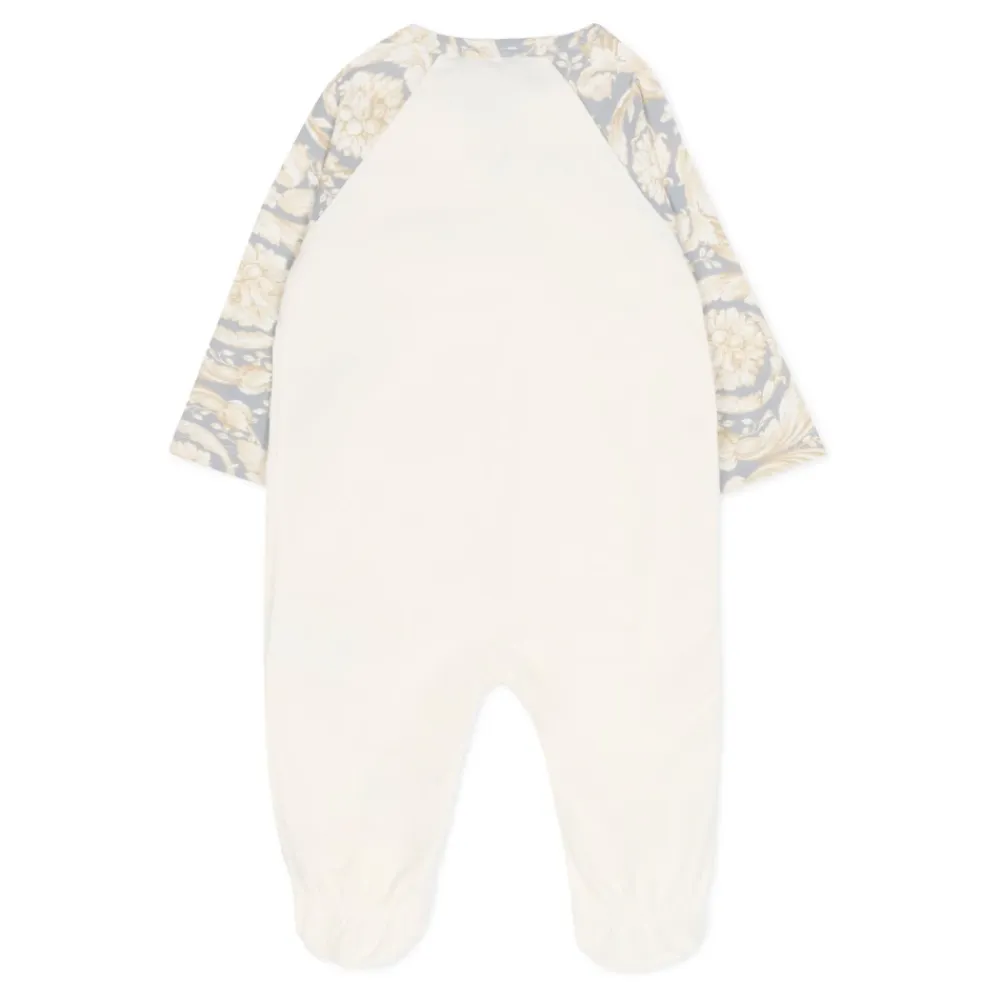 Versace Romper aus einem Stretch-Baumwollmischgewebe, veredelt mit barocken Ärmeldetails und einem grauen Logo für einen edlen Look. Mit Rundhalsausschnitt, vorderem Druckknopfverschluss und integrierten Füßen für einfaches Anziehen. Wichtige Merkmale: Weiß | Baumwollmischung | Vorderer Druckknopfverschluss | Integrierte Füße | Rundhalsausschnitt | Lange Ärmel | Barock-Motiv auf den Ärmeln | Graues Versace-Logo auf der Vorderseite | Zusammensetzung & Pflege: 91% Baumwolle | 9% Elastan | Maschinenwäsche bei 30°C.