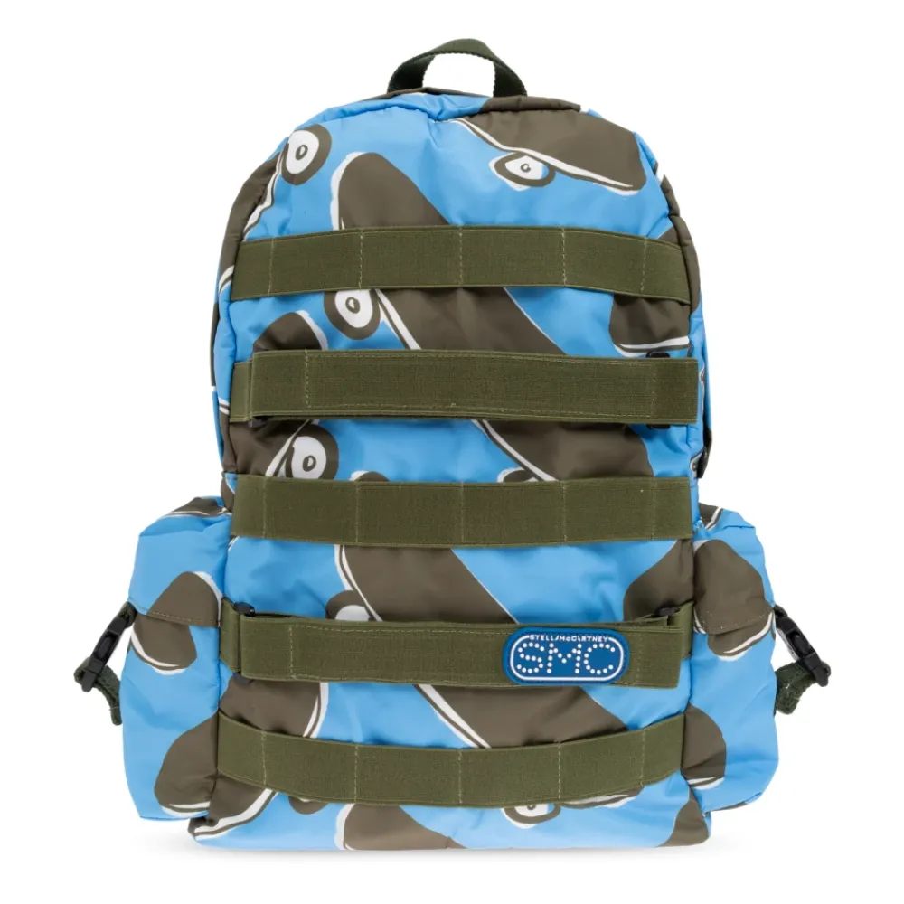 Wir präsentieren den BEDRUCKTEN RUCKSACK aus der exklusiven STELLA MCCARTNEY KIDS-Kollektion, wo Eleganz auf Funktionalität trifft. Hergestellt aus strapazierfähigem synthetischem Stoff, hauptsächlich in Blau mit Oliven- und weißen Akzenten, ist dieser Rucksack eine ausgezeichnete Wahl für jüngere Benutzer. Abstrakte Muster, die Augen ähneln und unregelmäßig auf der Oberfläche platziert sind, verleihen ihm einen einzigartigen Charakter. Die durchdachte Konstruktion umfasst olivfarbene Riemen, ein Hauptfach mit doppeltem Reißverschluss und praktische Seitentaschen. Verstellbare Riemen sorgen für Komfort, während das Markenlogo auf der Vorderseite die prestigeträchtige Natur des Produkts betont. WARUM SOLLTEN SIE DIESES PRODUKT KAUFEN? * Strapazierfähiger, hochwertiger synthetischer Stoff. * Einzigartiges Muster und Ästhetik, maßgeschneidert für eine jüngere Altersgruppe. * Funktionale Lösungen wie zusätzliche Taschen und verstellbare Riemen. * Exklusives Design der renommierten Marke STELLA MCCARTNEY KIDS. Höhe: 40 cm Breite: 28 cm