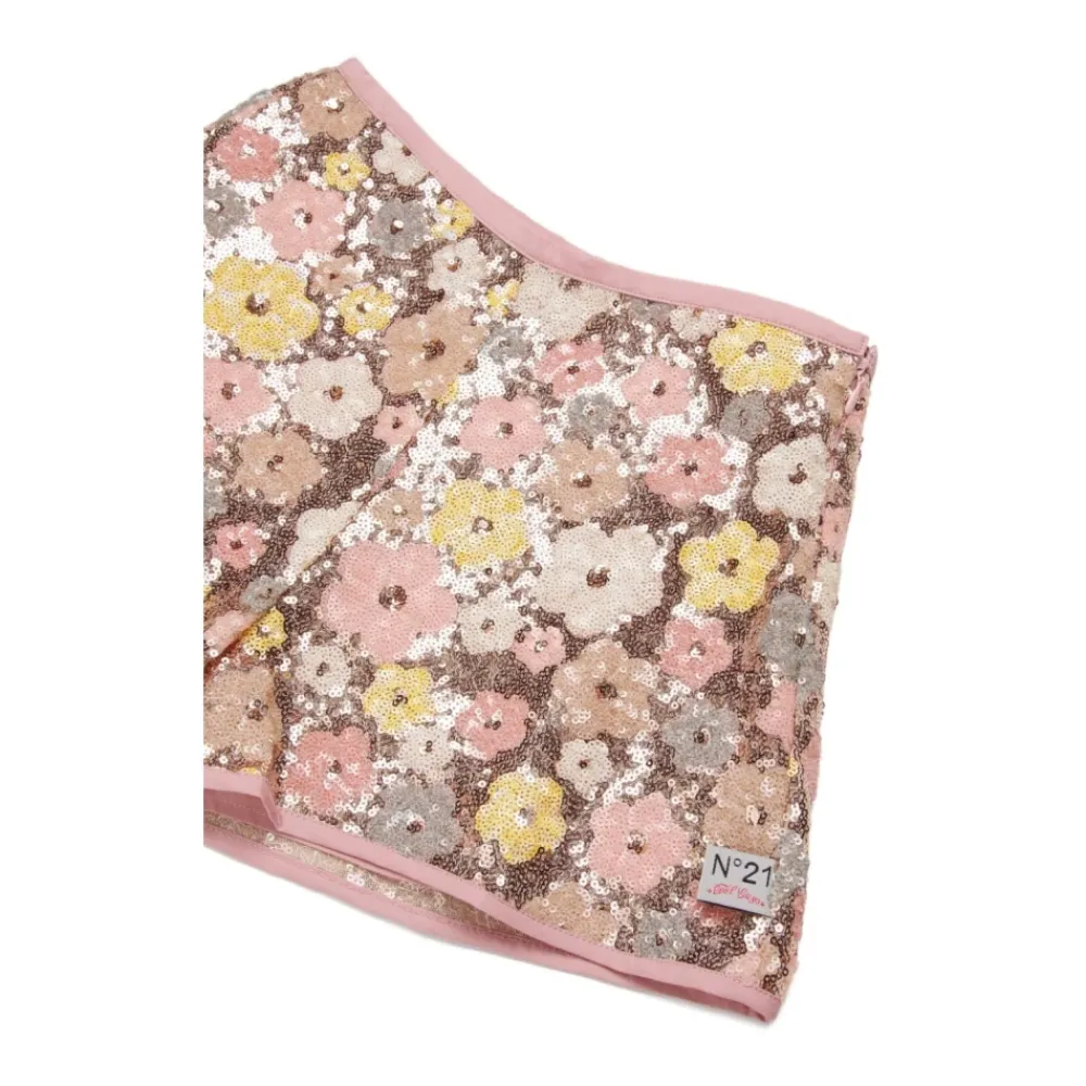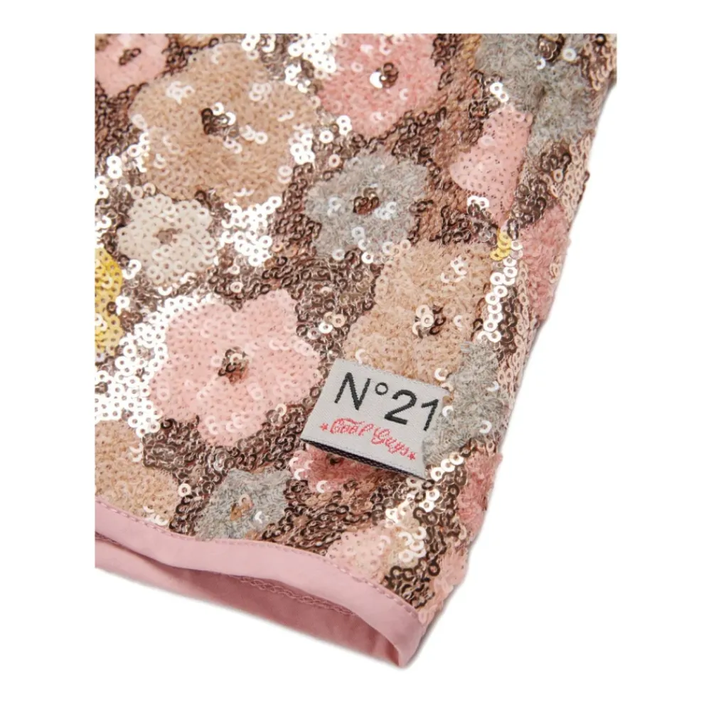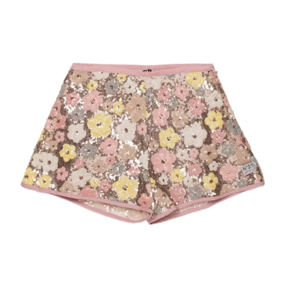 N21 Shorts mit Paillettenbesatz mit einem rosa-gelben Blumenmuster, versehen mit einem verdeckten Reißverschluss und einem Markenlogo-Detail. Hauptmerkmale: Rosa | Gelb | Verdeckter Reißverschluss | Rosa-gelbes Blumenmuster | Paillettenbesatz | Logo-Detail