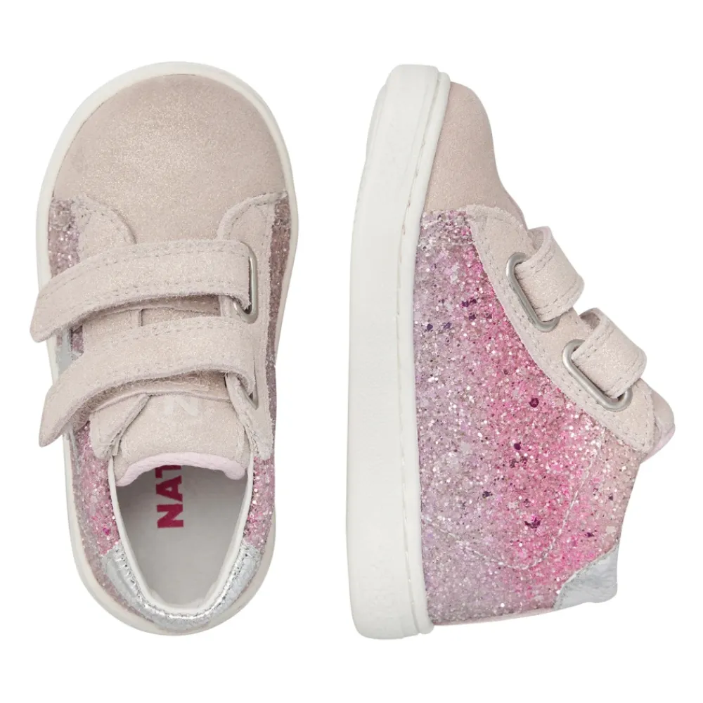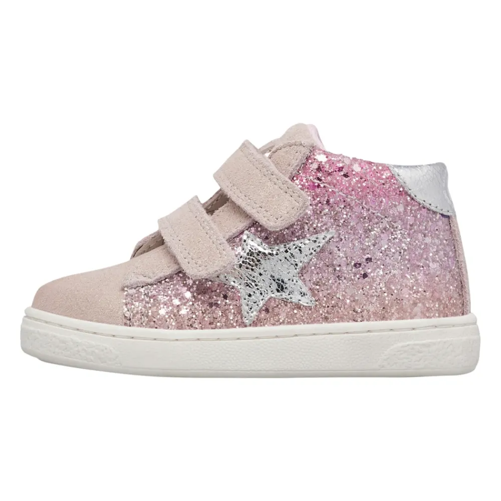Knöchelhoher Turnschuh mit Obermaterial aus Glitzerstoff in schattierten Tönen, mit Wildlederkappe und laminierten Details an der Kappe und am Sternaufnäher. Doppelter Riemenverschluss, Futter und Innensohle aus Leder, Gummisohle mit individuellem Rand.