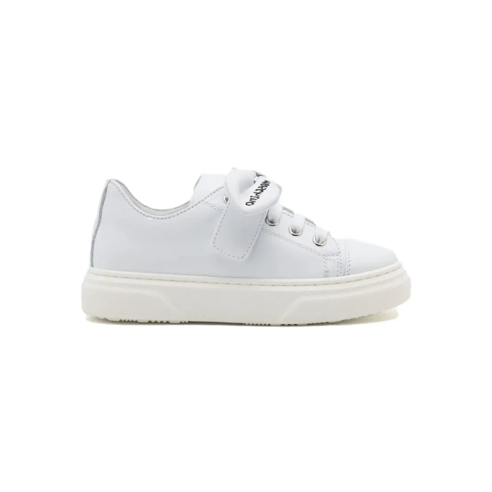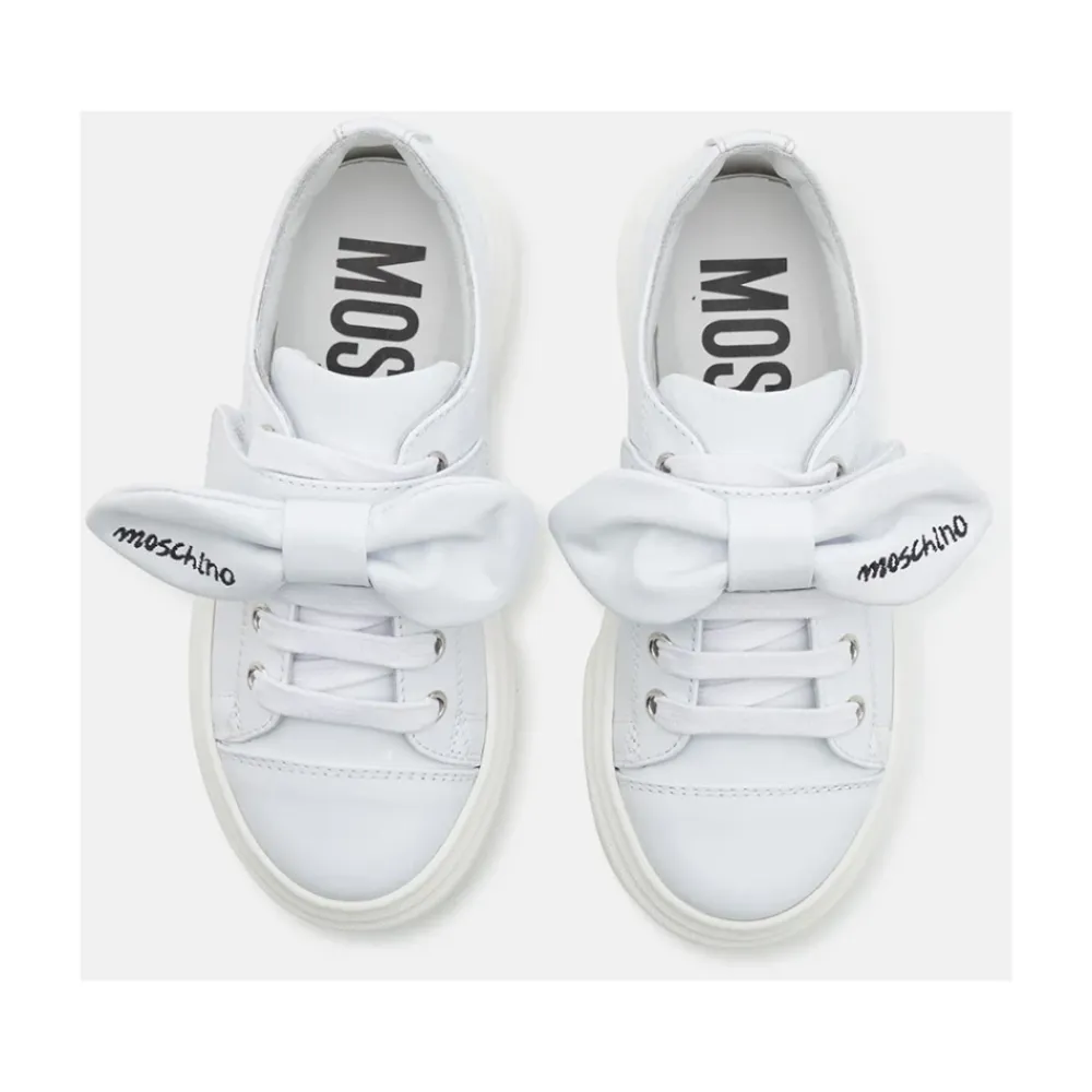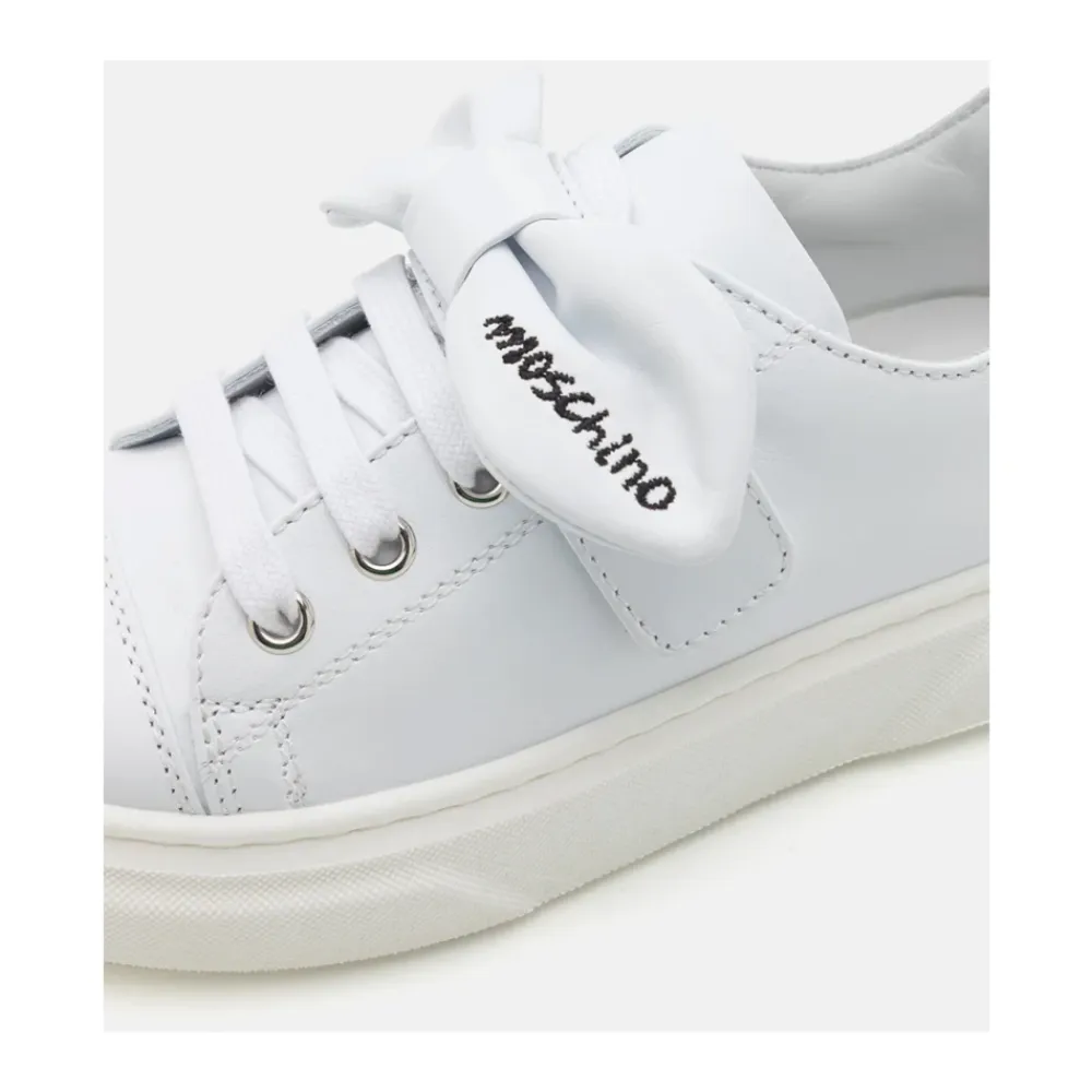 Moschino Leder-Sneakers mit einer charakteristischen Logo-Schleife auf dem Obermaterial. Das schlichte Low-Top-Design kombiniert einen Schnürverschluss mit einer strapazierfähigen Gummisohle für den täglichen Gebrauch. Hauptmerkmale: Weiß | Leder | Schnürverschluss | Gummisohle | Logo-Schleife auf dem Obermaterial | Runde Zehenpartie | Zusammensetzung & Pflege: Leder
