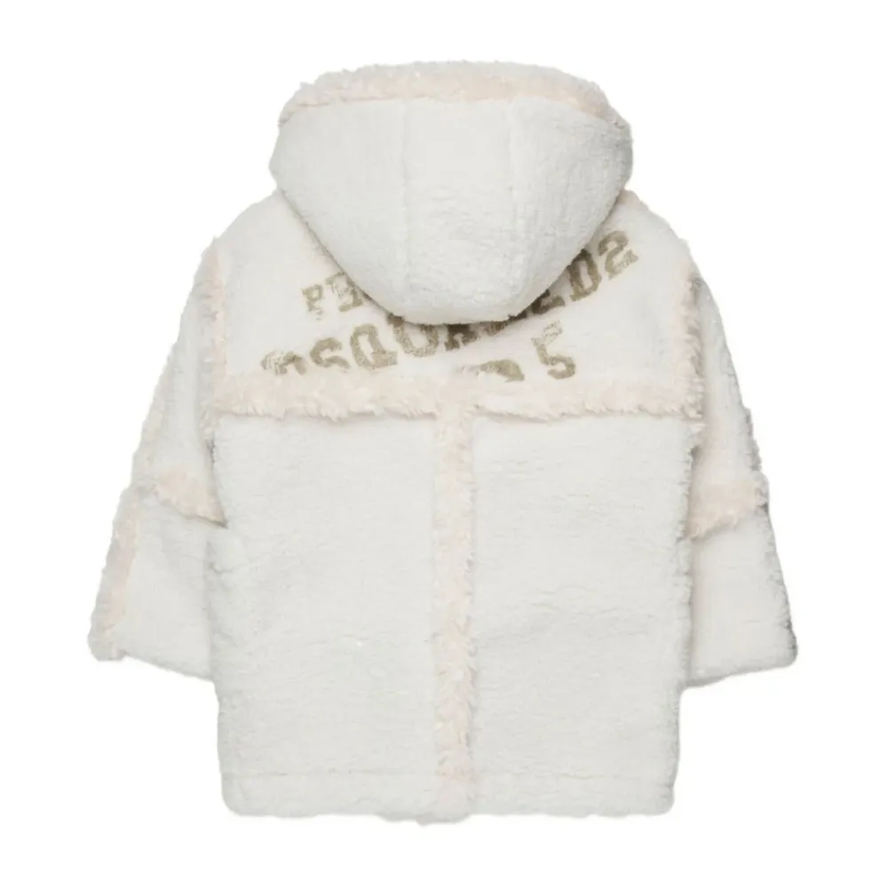 Die Dsquared2 Soft Faux Shearling Jacke kombiniert plüschiges synthetisches Shearling mit praktischen Details – eine Kapuze, Knebelverschluss und Vordertaschen – für warme Alltags-Oberbekleidung. Hauptmerkmale: Weiß | Milch | Polyester | Kapuze | Knebelverschluss | Zwei aufgesetzte Vordertaschen | Weiches Faux-Shearling-Finish | Logo-Print auf der Rückseite | Kapuzensilhouette | Zusammensetzung und Pflege: 100 % Polyester