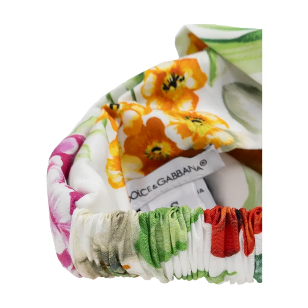 Wir präsentieren ein STIRNBAND aus der exklusiven Dolce & Gabbana Kids-Kollektion, das mit einem MULTIFARBENEN Blumenmotiv begeistert. Dieses außergewöhnlich auffällige Stirnband kombiniert lebendige Farbtöne von Grün, Gelb, Blau, Rot und Orange und bietet ein wirklich künstlerisches visuelles Erlebnis. Hergestellt aus glatter und weicher BAUMWOLLE garantiert das Stirnband Tragekomfort, und sein seidiges Aussehen unterstreicht ELEGANZ. Ein einzigartiges verdrehtes Element vorne verleiht ihm einen stilvollen Charakter, während das elastische Rückteil eine perfekte Passform für jeden Kopf gewährleistet und es zu einem idealen Accessoire für die Garderobe eines Kindes macht.