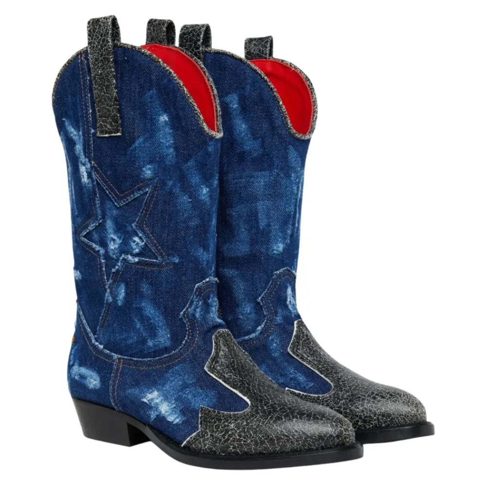 Dsquared2 Super Star Denim Texan Boots kombinieren Used-Look-Denim mit einer Lederkappe im Vintage-Look für einen robusten Cowboy-Look, der sich für den Alltag eignet. Hauptmerkmale: Blau | Denim | Baumwolle | Kalbslederfutter | Gummisohle mit Masonit-Absatz | Used-Look-Denim mit ‚Super Star‘-Detail | Leder-Zehenkappe im Vintage-Look | Kontrastierendes gesticktes Logo auf der Rückseite | Cowboy / Texan Silhouette | Zusammensetzung & Pflege: 70% Baumwolle | 30% Ziegenleder