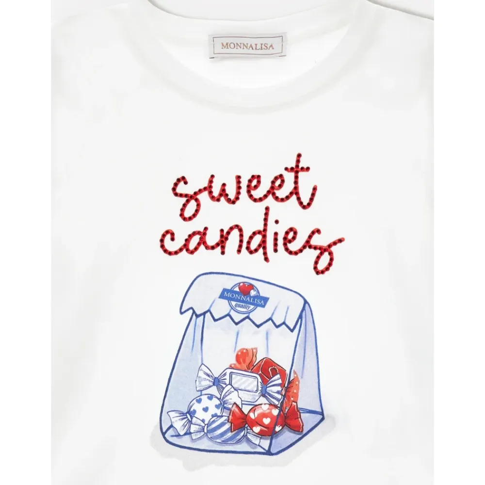 Das Sweet Candies T-Shirt von Monnalisa verbindet italienische Handwerkskunst mit einem verspielten Süßigkeiten-Motiv und bietet ein weiches Alltags-T-Shirt, das sich leicht für saisonale Garderoben kombinieren lässt. Hauptmerkmale: Weiß | Baumwolle | Weiches Tragegefühl für ganztägigen Komfort | Runder Halsausschnitt | Kurze Ärmel | Grafik-Süßigkeiten-Print auf der Vorderseite | Zusammensetzung & Pflege: 100% Baumwolle | Maschinenwäsche bei 30°C