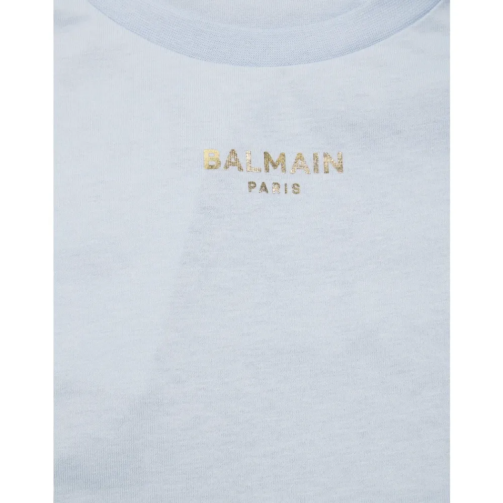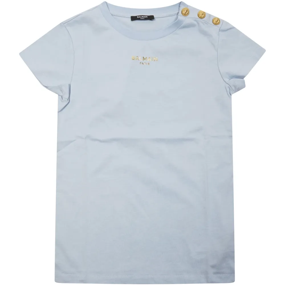 Das Balmain T-Shirt Logo Mini Bottoni Oro ist ein T-Shirt mit Logo-Akzent, das Mini-Goldknopfdetails für einen edlen Alltagslook hervorhebt. Hauptmerkmale: Blau | Azzurro | Knopfleiste vorne | Rundhalsausschnitt | Kurze Ärmel | Logo-Print | Mini-Goldknopf-Akzente
