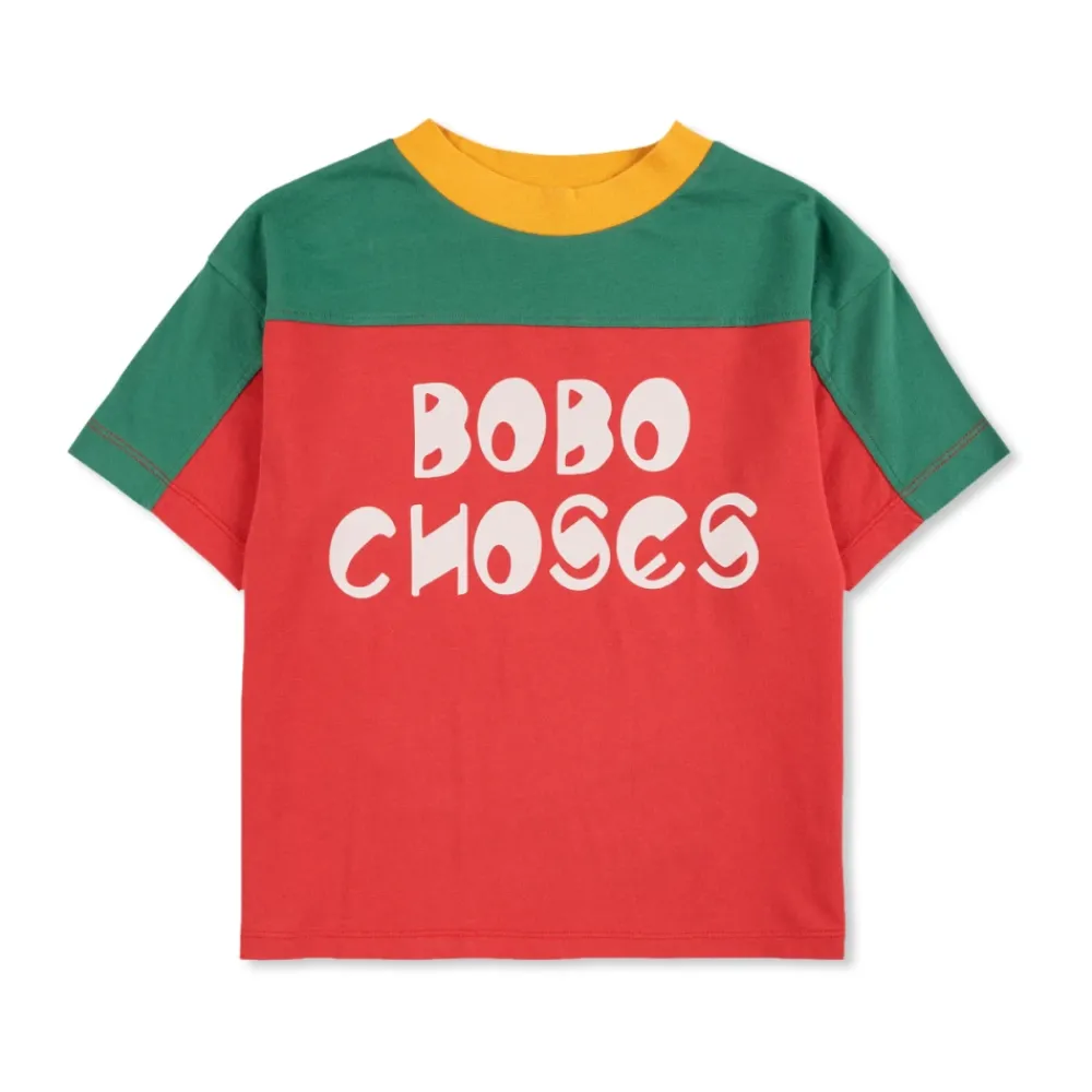 T-SHIRT MIT LOGODRUCK von Bobo Choses ist eine raffinierte Wahl für junge Enthusiasten lebendiger Farben und einzigartiger Muster. Das durchdachte Design basiert auf einem klassischen, einfachen Schnitt mit kurzen Ärmeln und einem runden Ausschnitt, der den Hals mit einem kontrastierenden gelben Kragen umschließt. Der einzigartige Charakter dieses T-Shirts wird durch sein geometrisches Farbblockieren definiert – der lebendige rote Boden und die Vorderseite sind perfekt ausbalanciert mit einem grünen oberen Abschnitt und kräftigen Ärmeln, die ein faszinierendes Ganzes schaffen. Im Herzen des Designs befindet sich ein großes, weißes „BOBO CHOSES“-Druck in einer stilisierten Schriftart, der den unverwechselbaren Stil des renommierten Designers ausdrückt. Hochwertige Baumwolle garantiert Weichheit und Tragekomfort, während die sorgfältige Verarbeitung und Farbsättigung den exklusiven Charakter des Produkts unterstreichen. WARUM SOLLTEN SIE DIESES PRODUKT WÄHLEN? * Originaldesign von Bobo Choses * Außergewöhnlich bequeme, weiche Baumwolle * Auffällige Farbkombination perfekt für kreative Kinder * Präzise Verarbeitung für Langlebigkeit * Einzigartiger Druck für zusätzliche Einzigartigkeit