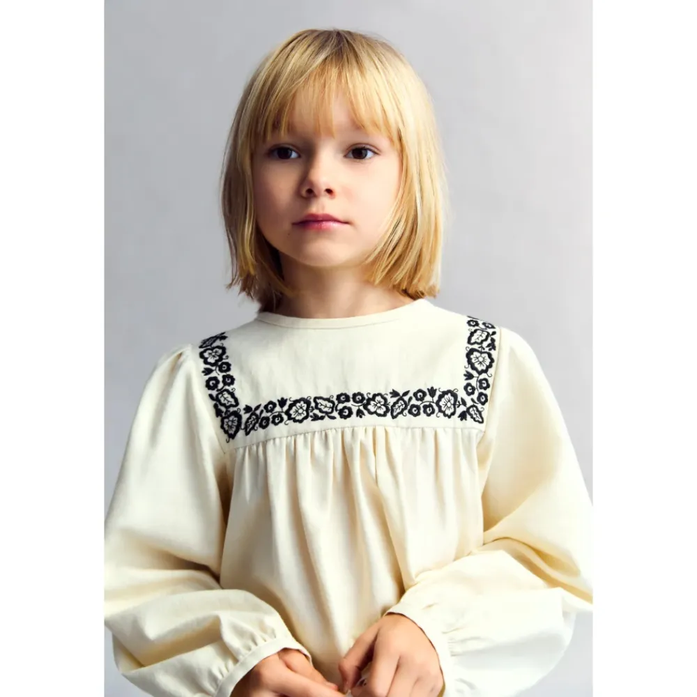Eine zarte Bluse mit einem Brustschnitt mit sanfter Raffung und subtiler Kontraststickerei für eine raffinierte, feminine Note. Sie hat eine Rückenöffnung mit einem tropfenförmigen Schnitt und Knopfverschluss, der Stil mit Tragekomfort kombiniert, perfekt für die Kombination mit Röcken oder Hosen. Modell: Höhe 118 cm. Trägt Größe 6Y Hergestellt in Portugal Farbkollektion: Moonlight White 100% Baumwolle