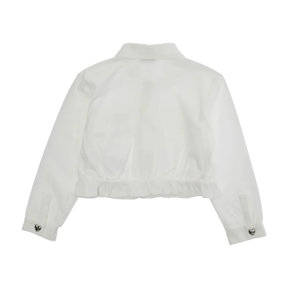 Heben Sie den Stil Ihres kleinen Mädchens mit dieser weißen Baumwolljacke von Moschino hervor, die einen niedlichen Teddybärendruck auf der Vorderseite hat. Perfekt für modische junge Damen!