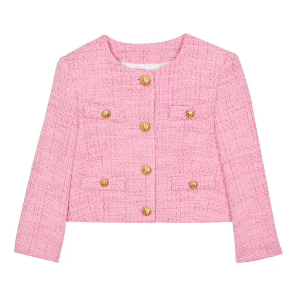 TweedjackeRundhalsausschnittLange ÄrmelVier Trompe-l’œil-Taschen mit Zierknöpfen vorneVier Knöpfe vorne„Lion chaîne“-Knöpfe aus goldenem MetallGerader SchnittHauptmaterial: 44 % Baumwolle, 38 % Polyester, 12 % Acryl, 3 % andere Fasern, 2 % metallisiertes Polyester, 1 % PolyamidHergestellt in ItalienArtikel: BW2B04E0209