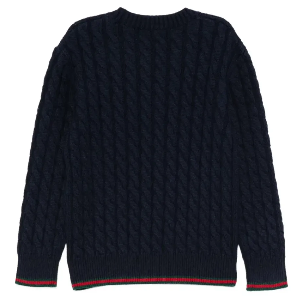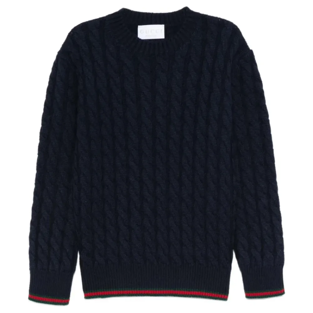 Der Gucci Wollpullover mit Web kombiniert eine klassische Zopfstrickkonstruktion mit dem charakteristischen grün-roten Web-Besatz des Hauses und bietet ein warmes, stilvolles Layering-Teil für kühlere Tage. Wichtige Merkmale: Dunkelblau | Grün | Rot | Wolle | Rundhalsausschnitt | Zopfmuster | Kontrastierender Web-Besatz an Bündchen und Saum | Gerippte Kanten | Lange Ärmel | Zusammensetzung & Pflege: 100% Wolle